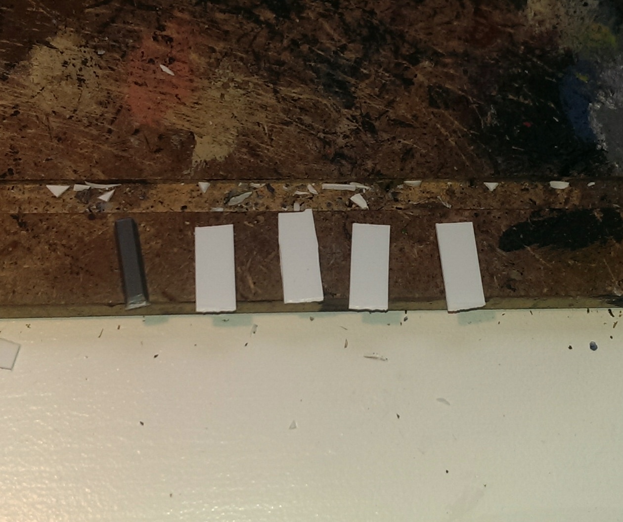 So I started with the powerklaw arms. I cut out strips of plasticard, 0,5cm wide and 1,5cm long. I want a gorilla look. The bit of sprue is just to make it simpler to glue together.