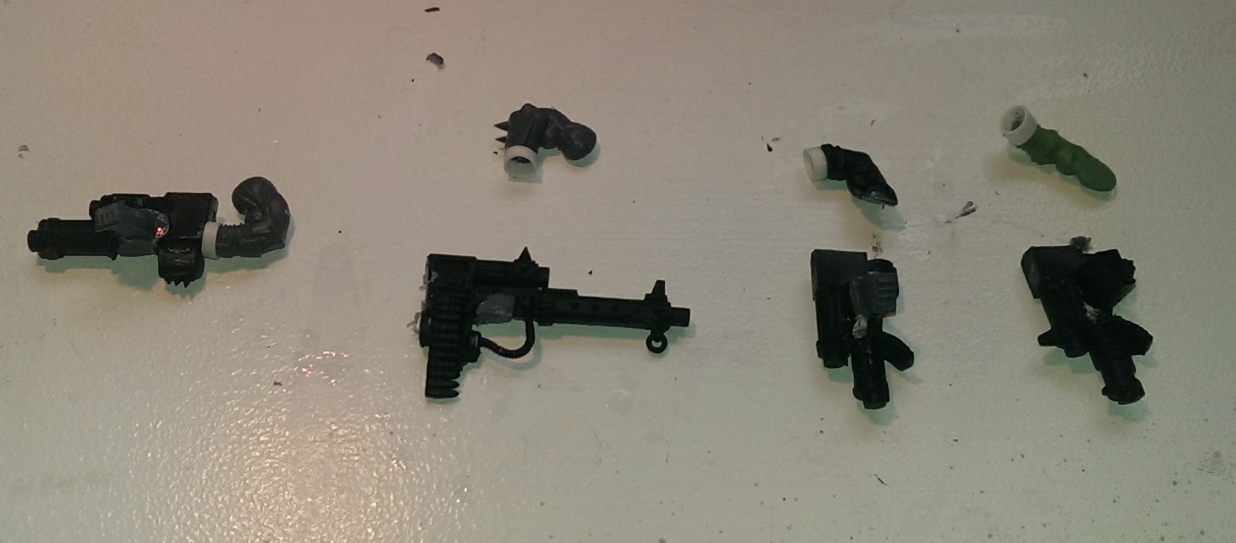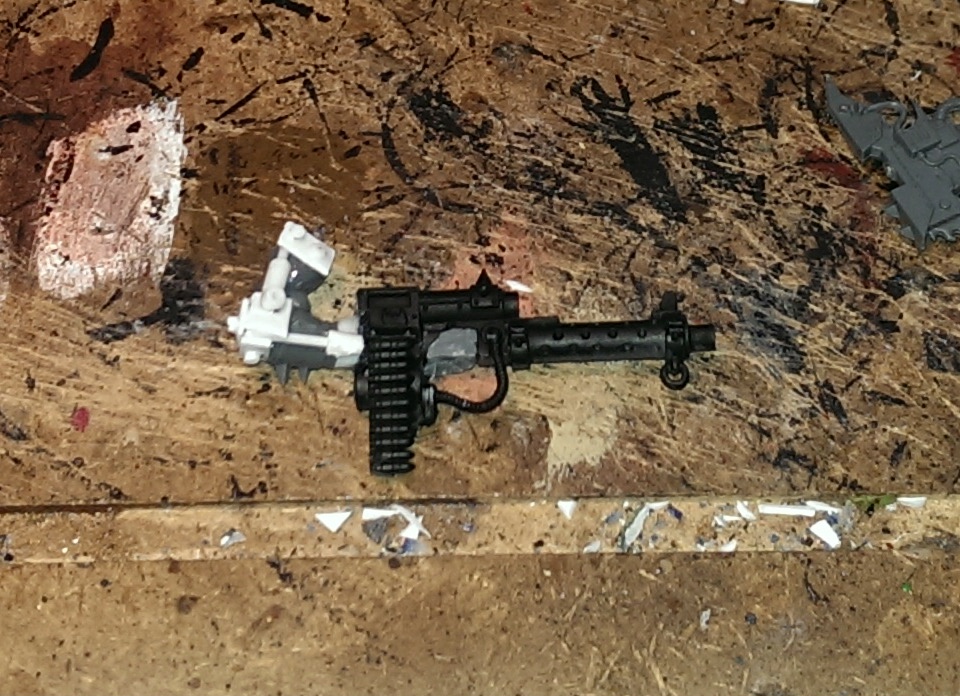 I use actual TL shootas for this. Cut away the rear bit and the hand that’s part of the mold. Here I also use tube spacers on the arms. So when the glue has set, detailing similar to the powerklaw arm.