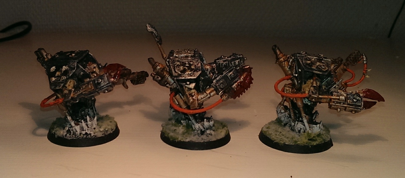 For this mob I wanted a couple of kombi-skorchas for variation. On the boss nob I didn’t have a lot of circular saws so I made his killsaws from a big choppa. End result works well I think.