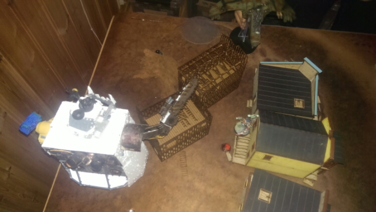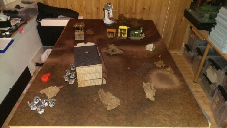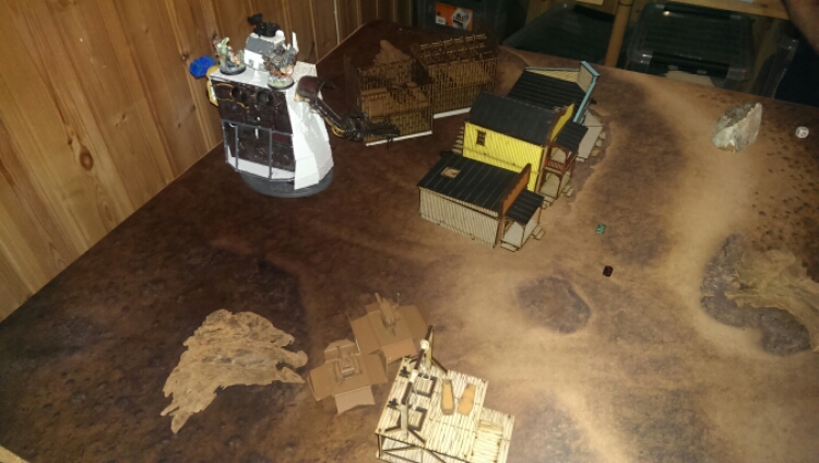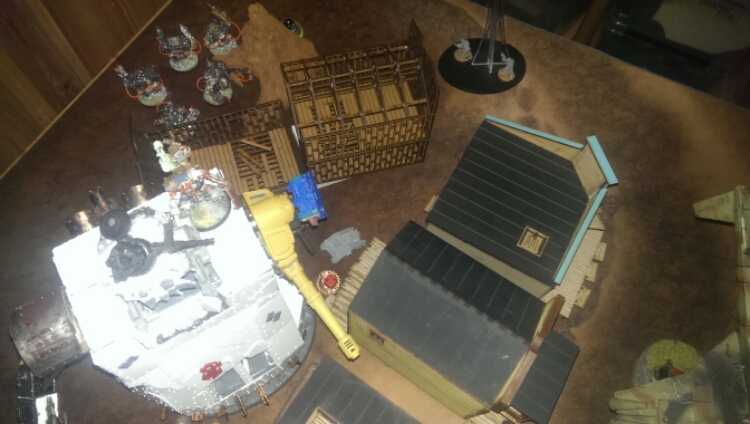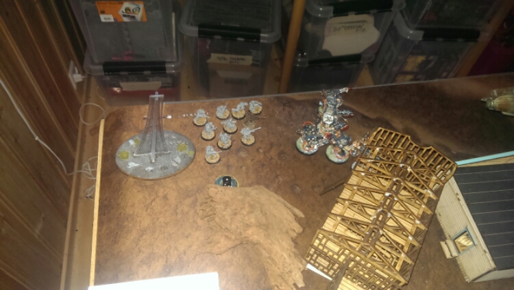 Stompa moves on a secondary objective, disembarked bully mob that moves towards his primary. A lot of ineffective shooting but the stompa takes out the nearest sentry squad (first blood) and halved the other.