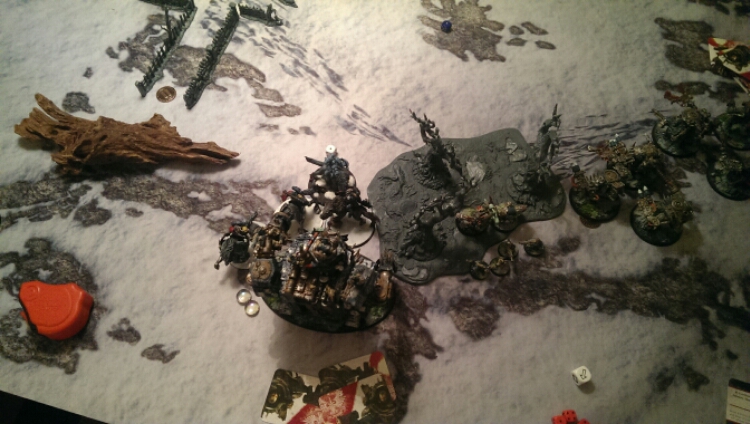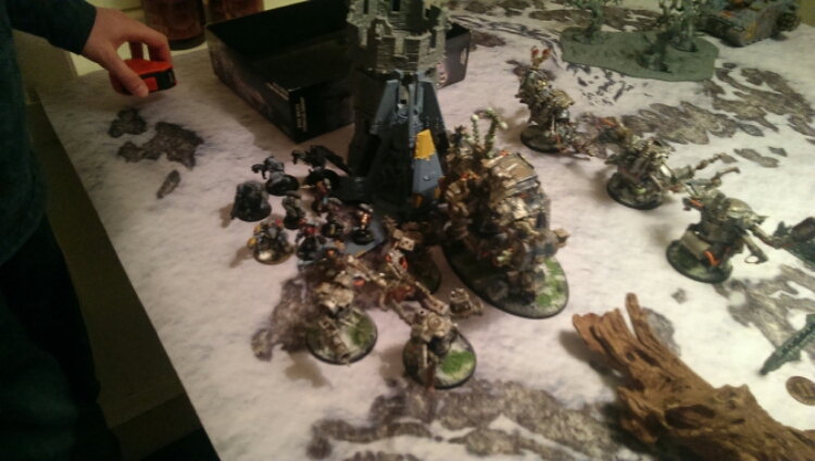 In the assault the wolves charged but the Gorkanaut did well and killed two (4w) versus 2 hp. I win combat! He takes 1 vp with the raider.
