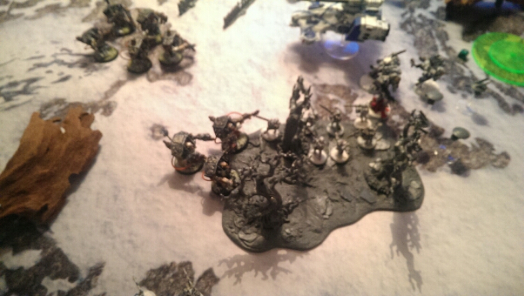 I target the firewarriors in the corner with one mob to kill them and get linebreaker and the other towards the center. I kill 3 of the firewarriors and the rest flee. The other runs 6″ towards the center. Some luck at least.