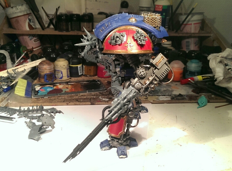Looking good so far, I especially like the Zombie Dragon head used as an helmet. And that Soulgrinder arm in the place of the chainsword is sweet too. Personally I would add other bone-bits all over it, to make it a giant walking skeleton, the incarnation of death, but that’s just my fixation with overexaggerating. 😉 Which colours are you going to paint it in?