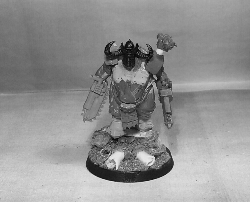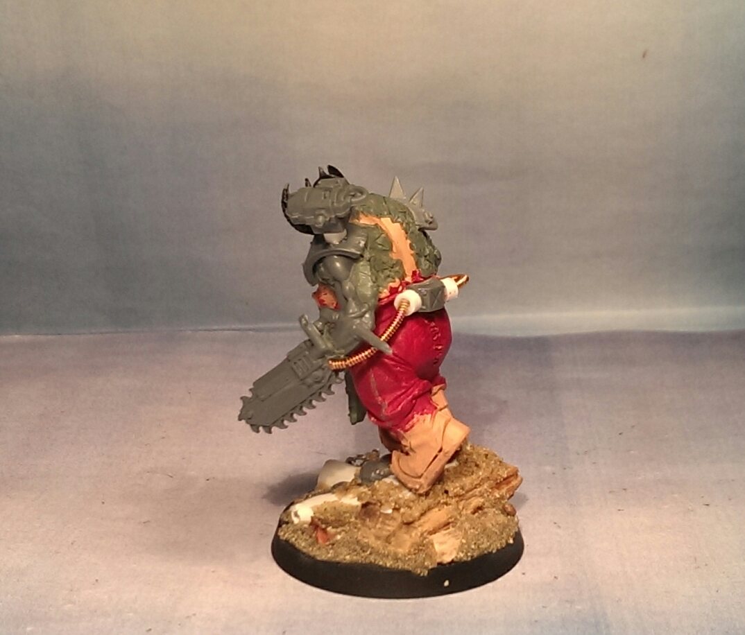 This particular being was previously a work leader. This is known due to the searchlight mounted on his shoulder. His arms are double fitted massive chainsaws. Now undoubtedly used to combat the enemies of the former slaves. The helmet has been fitted with horns and other macabre items. This is likely to show status within the Pit Slaves.