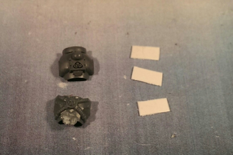 For the arms I remove the details on the pads by scraping it off with a knife. I then cut the shoulder joint off the arms as I’m using the larger terminator ones instead. I don’t glue these together until I’ve attached the pads to the torso.