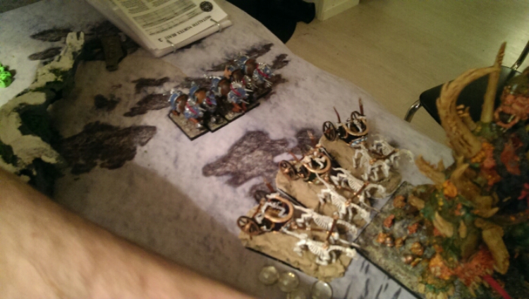 Carrions, archers on foot and horse archers take 1 objective each. Chariots, giant and king move just a tad forward as I’m out of charge range anyway.