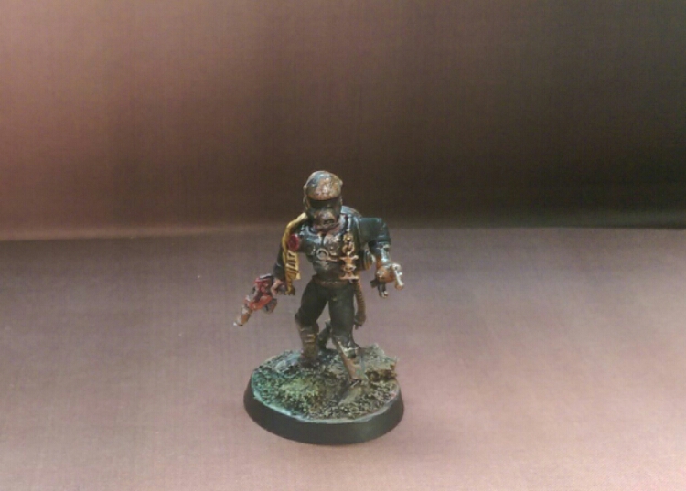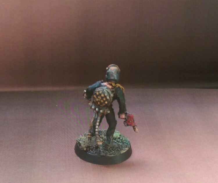 Great looking model in both build and paint scheme! That Valkyrie pilot head works perfectly here (it is also a head rarely seen in conversions). Great choice for a sidearm too! That is my favorite laspistol that Games Workshop makes (Forge World I guess…), mainly due to its small size. (: