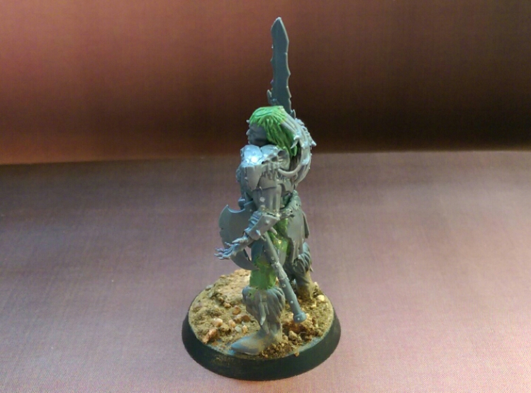 Very nice work. I like the original model, but was a little perplexed with his “I’m standing here pose.” GW has done a pretty good job of making fairly dynamic models as of late (but sometimes they take dynamism a little too far and make some wonky looking stuff). You have made a much more subtle and interesting pose. I think the sword on the base model is a little too big for my tastes, but your extending on the handle makes it make more sense.