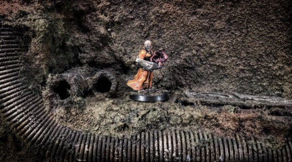 The texture was achieved by applying several layers of wood-glue, sand, earth and static grass. On some areas I also added crackle paint. It’s important to vary the texture types when doing large areas like this. Its also important to remember that you can’t have too much texture. You can always apply another layer of glue and sand!