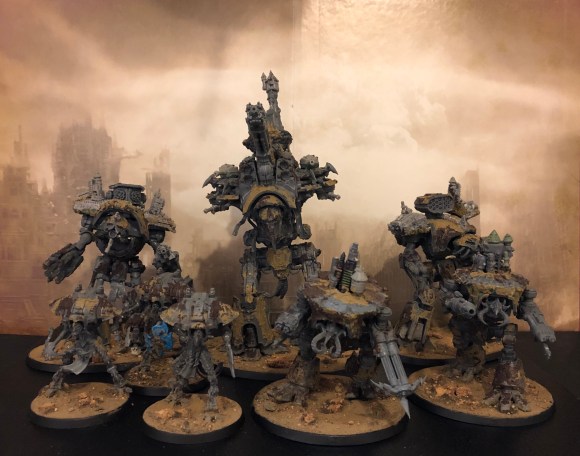 So after almost a year this is nearing the stage where I can put paint to brush! Reason this has taken so much time is due to me struggling with how I wanted my warhounds to look. They`ve really been through a fair few adaptations before I was happy with them. When that was sorted though I wasted no time in mucking down the legio to fit the theme of abandoned titans forced into service again by the sorcerers of the Silver City. This will (hopefully) tie in with the planned terrain which will be an abandoned Hive by the sea.