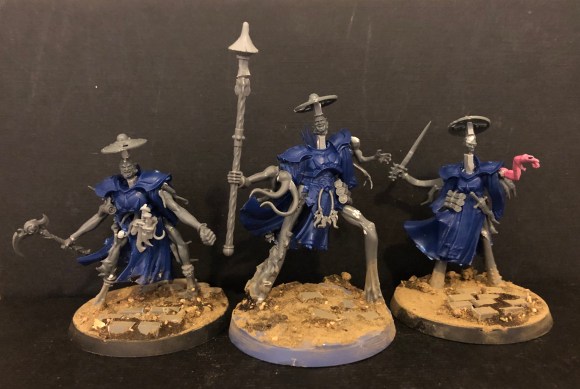 To elongate the limbs I used Horror and Flamer limbs. Glued on a few more bitz and bobs to strengthen the theme and remove them more from the origin. The heads are basically deathrattler shields, bits of sprue, goliath heads on the males and escher for the female.